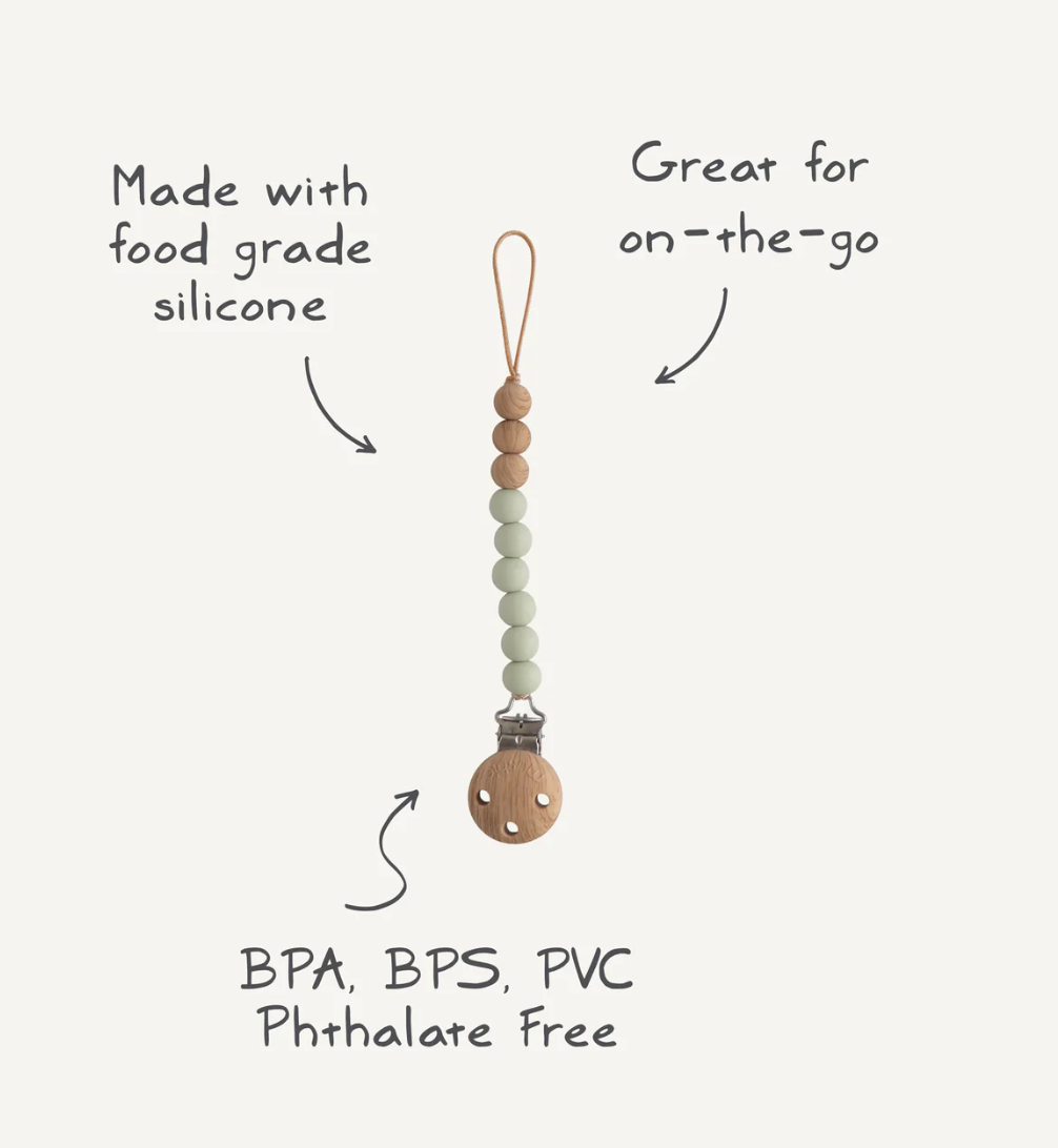 The Mushie silicone pacifier clip offers durability, function and simplicity to families on-the-go. Made from 100% food-grade silicone, our clip features a faux wood silicone clasp that brings a modern take to a traditional favorite. With a simple stack of silicone beads in two complementary colors, the Eva clip offers a sophisticated touch to your pacifier accessories. The clip is easy to clean and helps keep soothing items in reach for little ones.