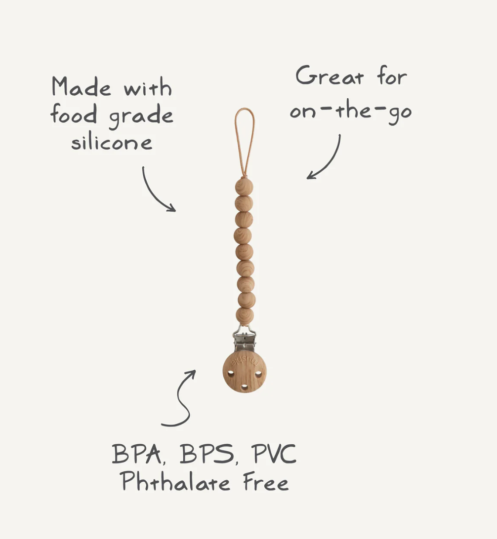 The Mushie silicone pacifier clip offers durability, function and simplicity to families on-the-go. Made from 100% food-grade silicone, our clip features a silicone clasp that brings a modern take to a traditional favorite. With a single color stack of silicone beads, the Hera clip offers families a beautiful accessory in a minimalist design. The clip is easy to clean and helps keep soothing items in reach for little ones.
