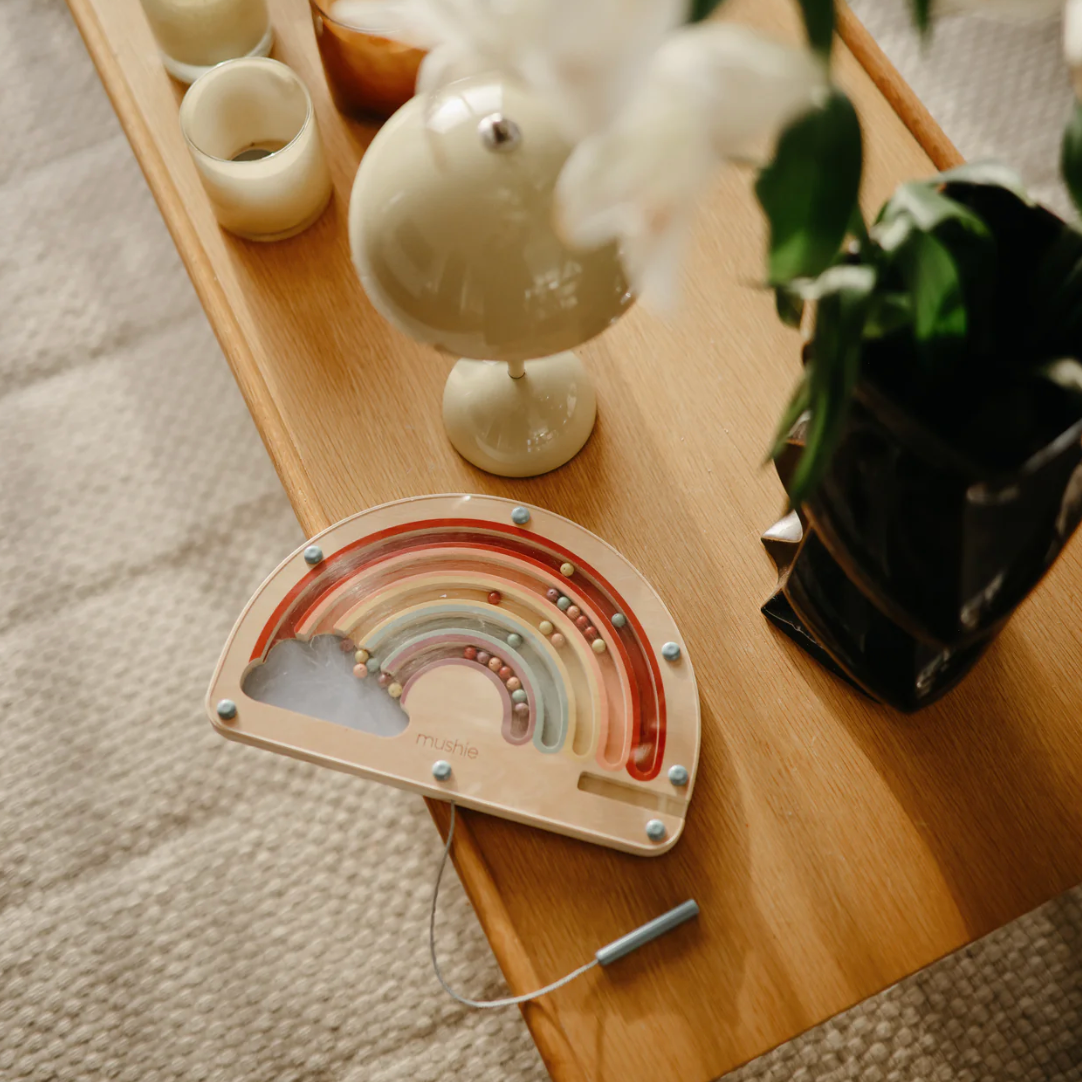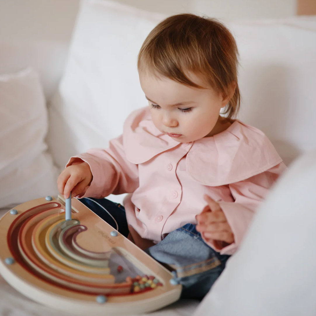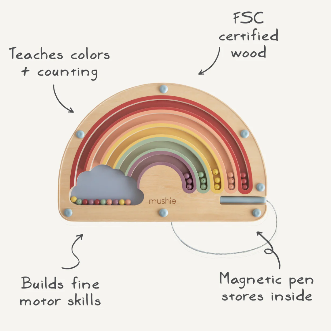 Add a splash of color to playtime with our Wooden Magnetic Rainbow Maze. Using the attached magnetic pen, littles can guide each colorful bead along the pathways, matching them to their corresponding arches while refining fine motor skills and hand-eye coordination. With its timeless design and engaging, screen-free play, this toy is a delightful blend of learning and fun.