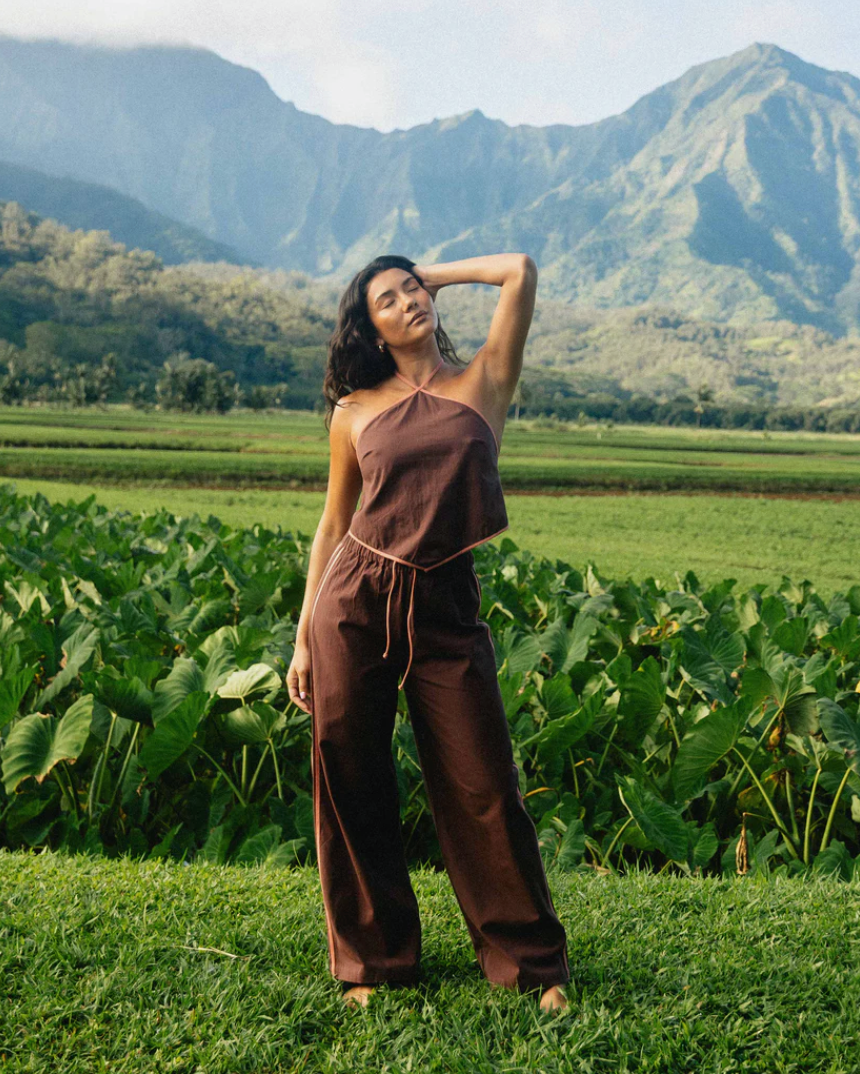 Our cotton-linen blend pants bring easy style to your wardrobe. The elastic waistband and drawcord ensure a perfect fit, while contrast side binding and metal plate details add subtle sophistication. Featured here in the Brown colorway.