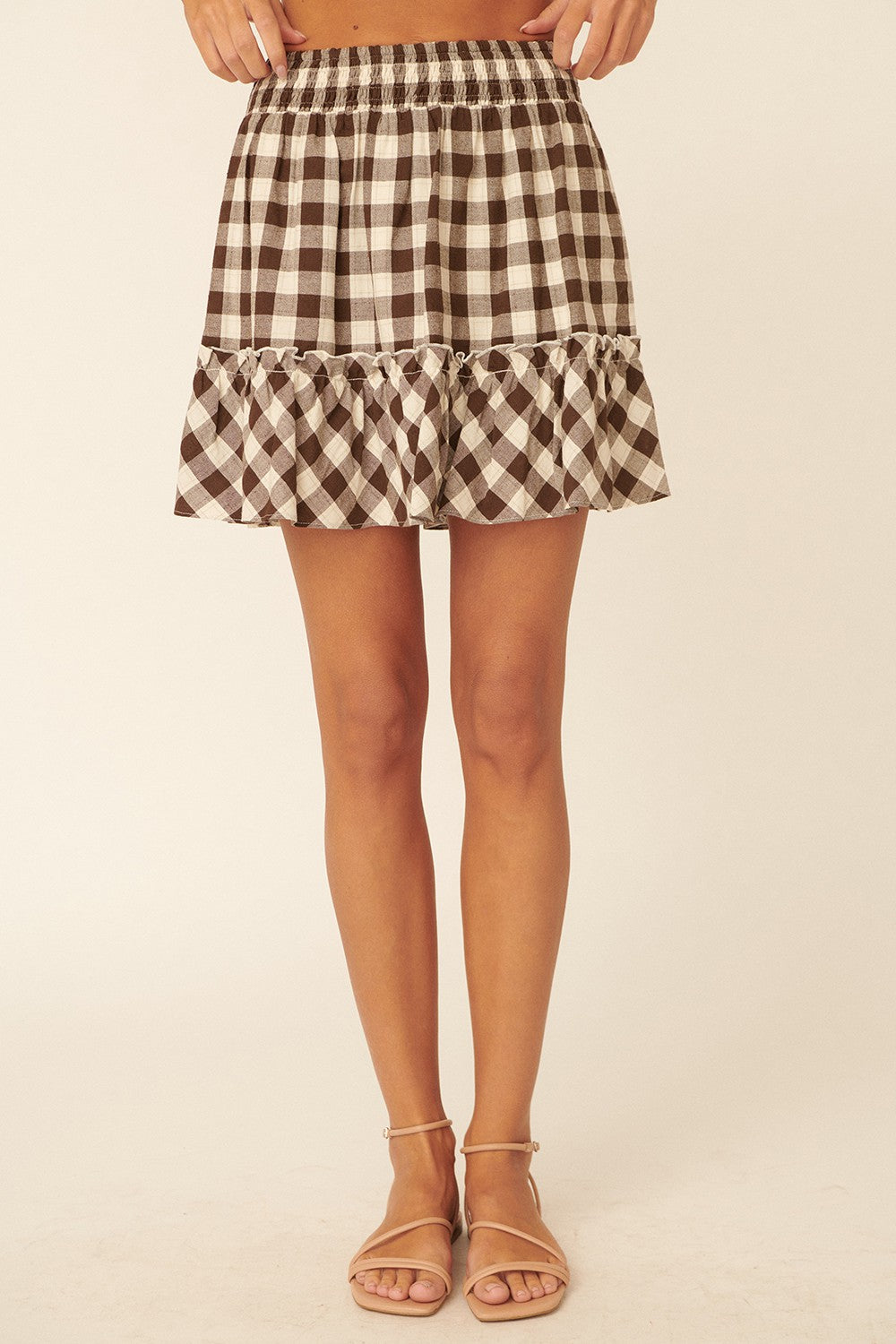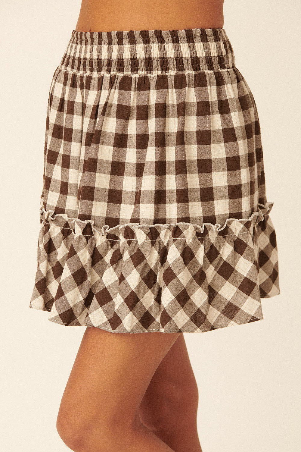 A plaid, woven print mini skirt with the following features: Smocked waist. Ruffle hem with trim detail. Relaxed fit. Model Info: Height: 5 ft 9 in | Bust: 31 in | Waist: 24 in | Hips: 34 in | Wearing Size S.