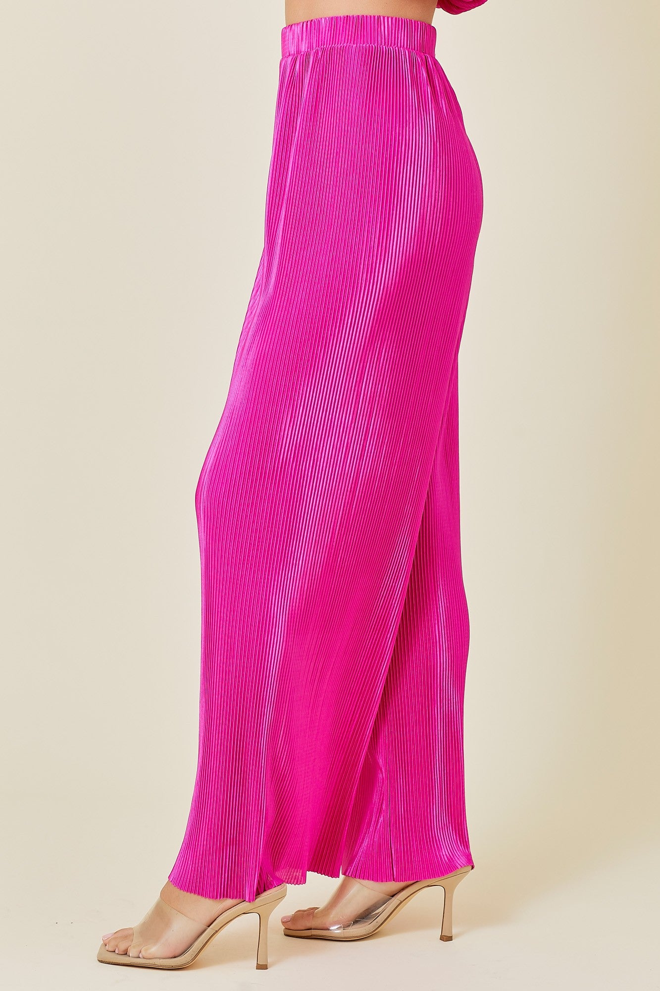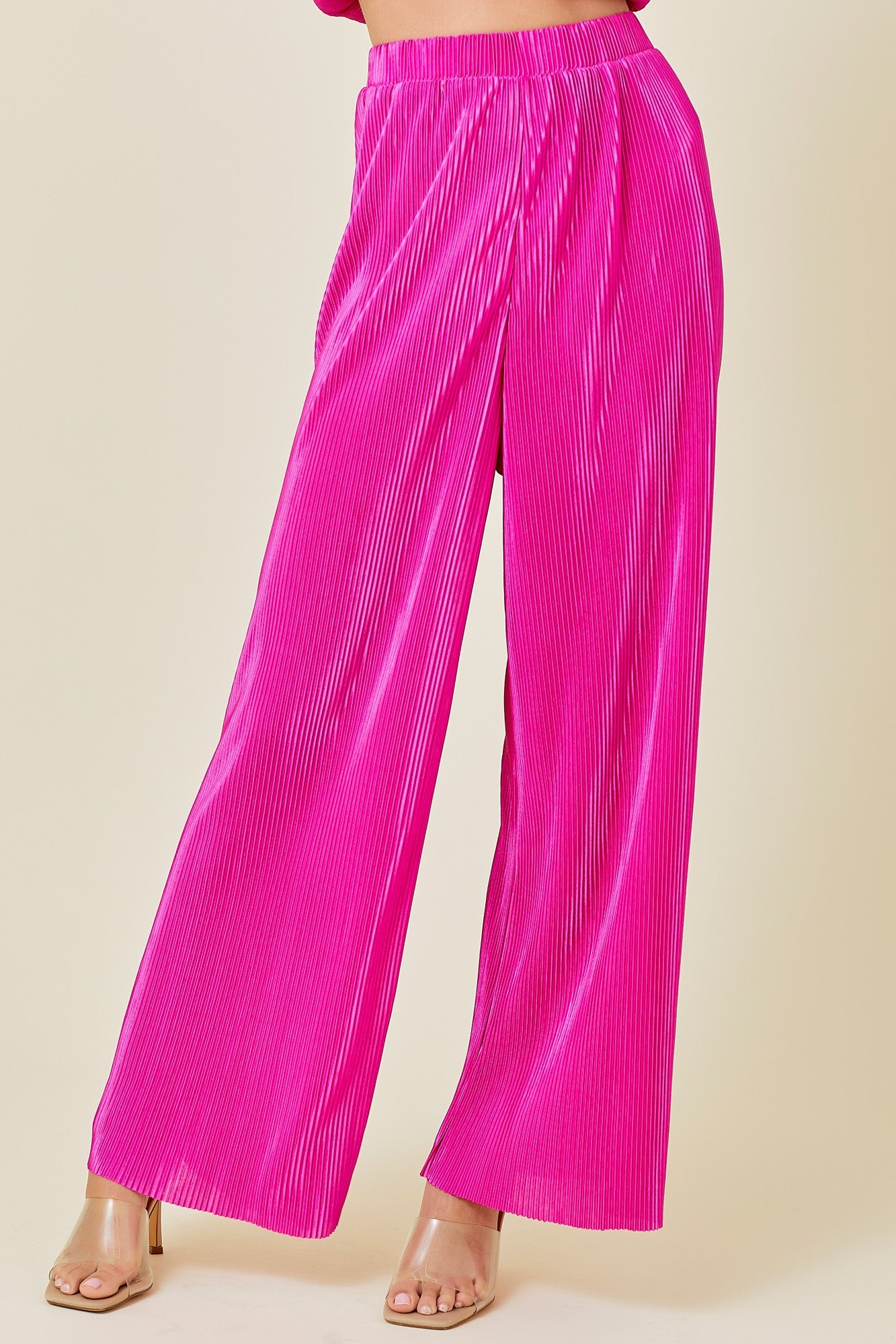 Pleated Woven High Waisted Wide Leg Long Pants (Fuschia)