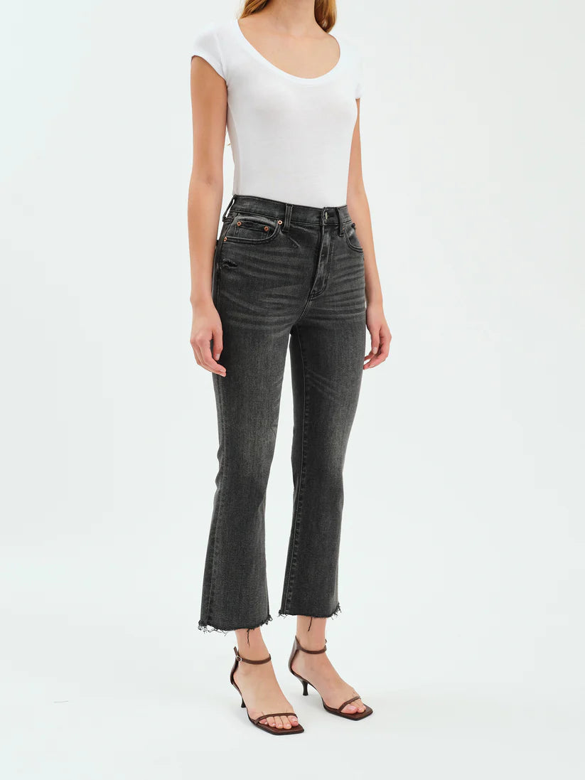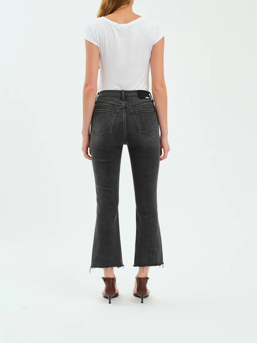 In a faded black wash with a slight crop and distressed hem, the Shy Girl in Haunted is a cropped flare that can be worn with any kind of shoe. Crafted from our "Repreve" denim it is a stretch fabric created from recycled plastic.