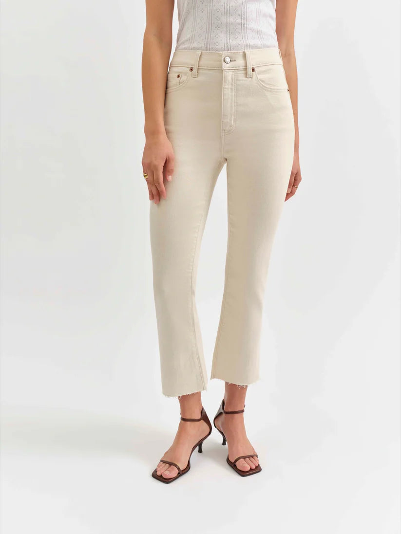 The neutral you've been waiting for. This creamy colored crop flare bootcut is a clean wash with mixed metal hardware and a scissor cut hemline that hits the perfect spot for putting your footwear on display.