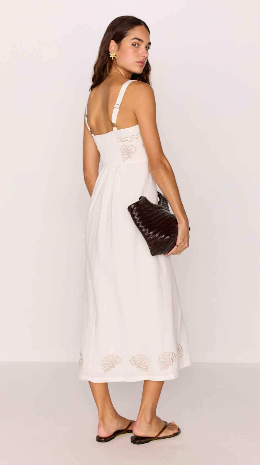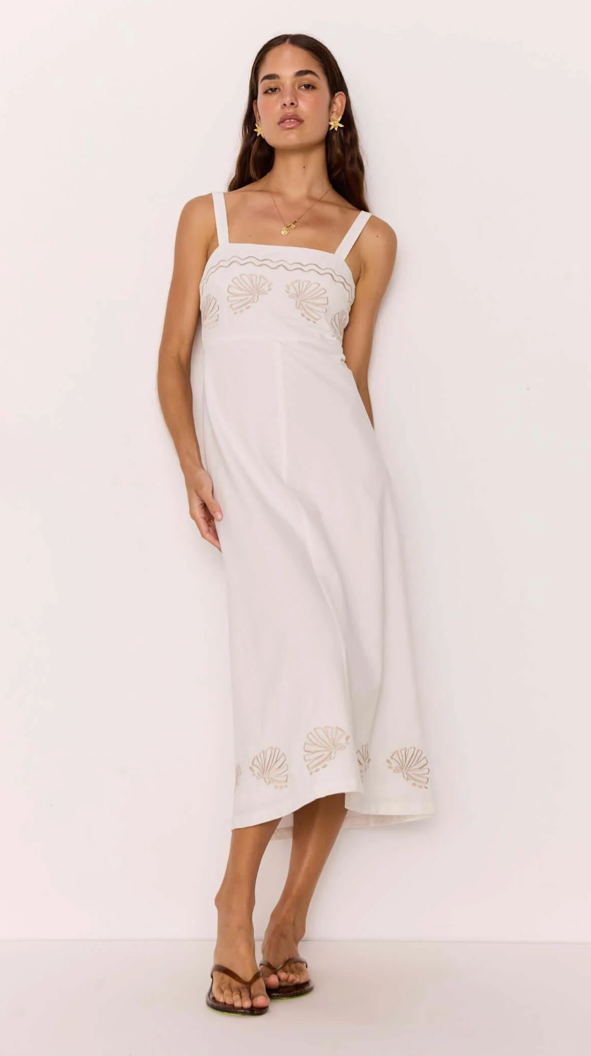 Soft, romantic, and timeless - the Hera White Midi Dress with Embroidered Shell Detail is made for long lunches and sun-drenched afternoons. Crafted from a lightweight cotton-viscose blend, this elegant style features delicate shell embroidery along the neckline and hem, a fitted bodice, and an airy A-line skirt. A summer staple that feels both effortless and refined.