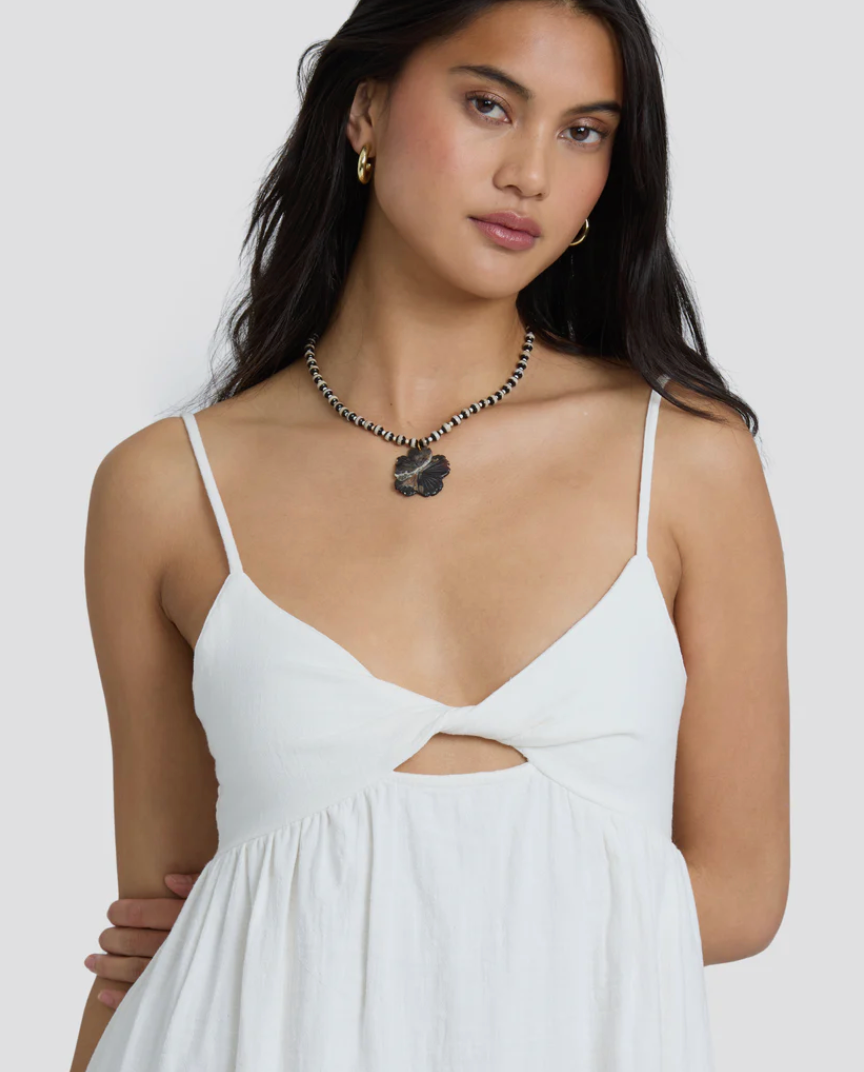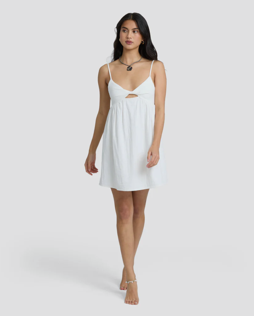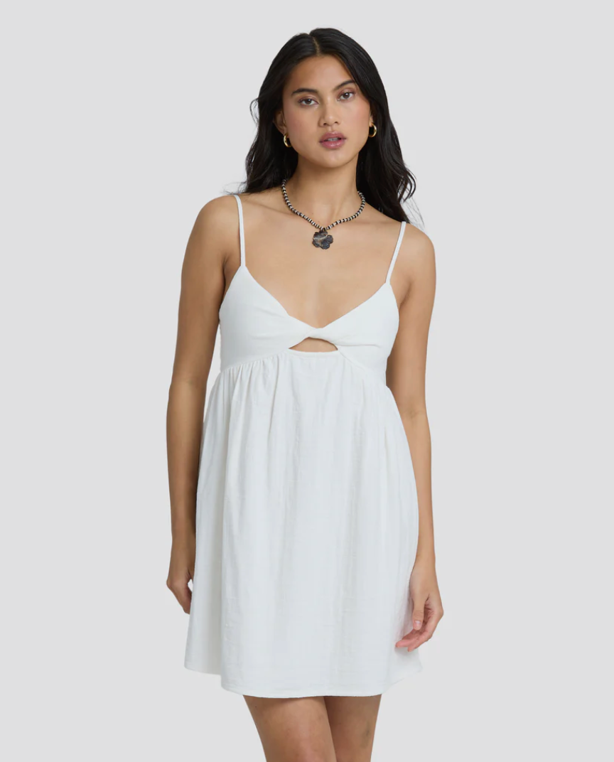 - Features: Twist front detail at bodice with small cut-out, smocking at back bodice