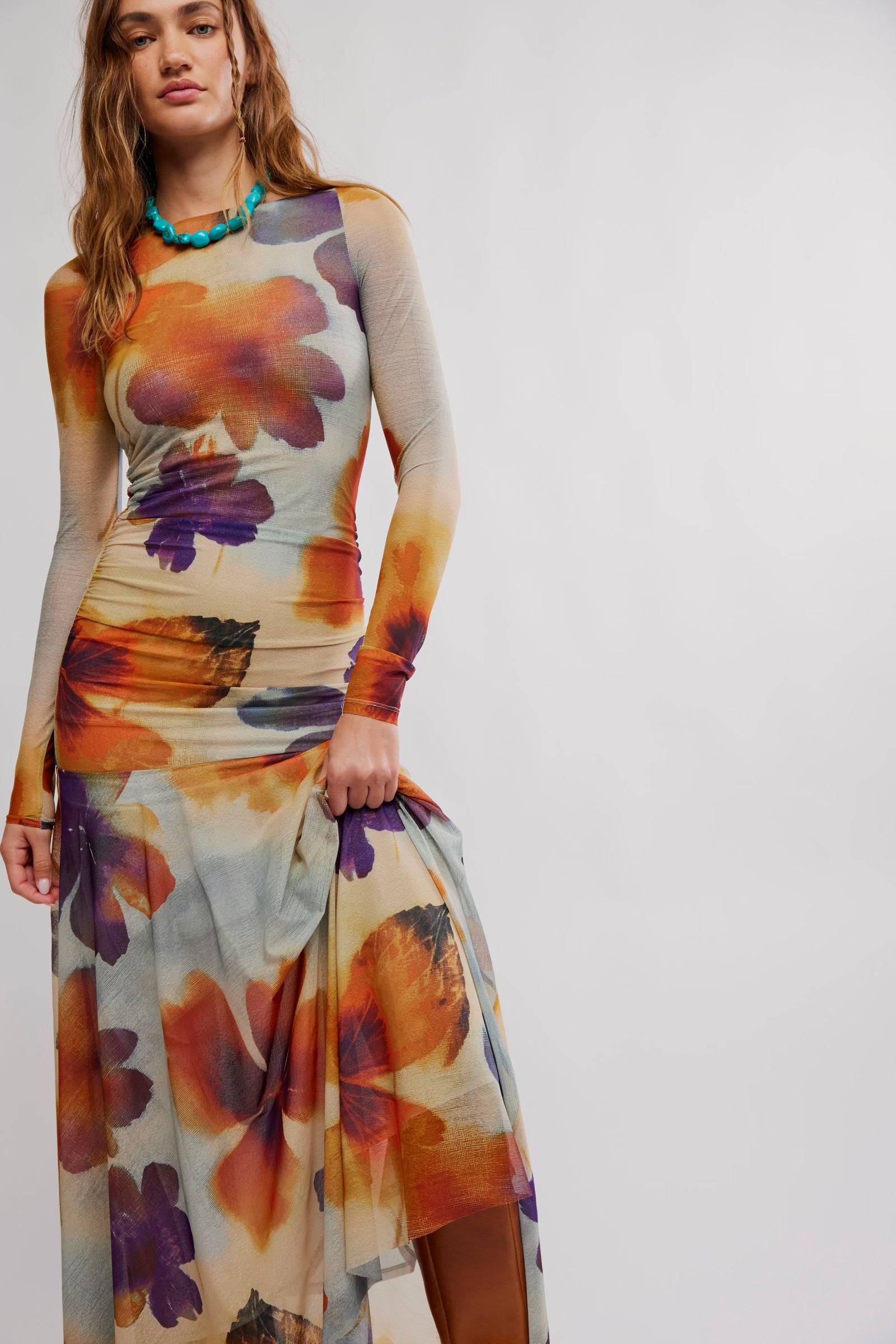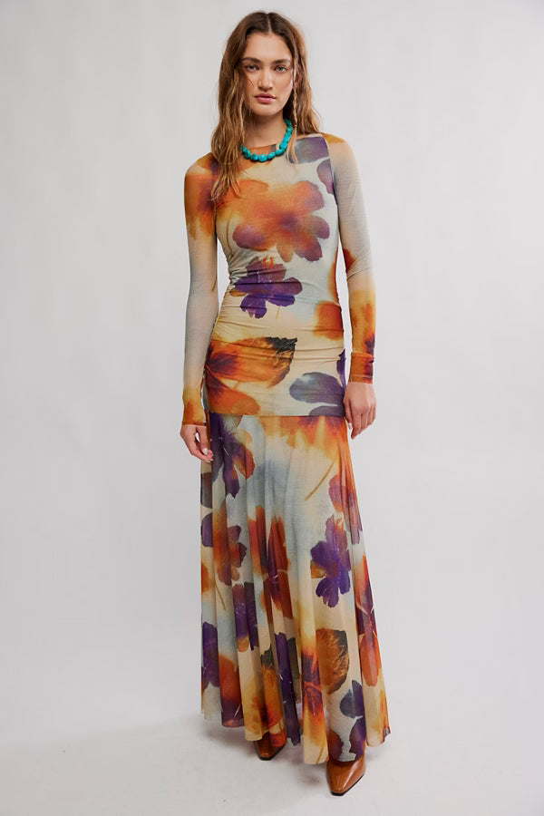 An effortlessly edgy design that transitions seamlessly from day to night, this versatile maxi dress boasts a forever-flattering fit-and-flare silhouette, ruched detailing for added waist definition, and a too-cool mesh fabrication.