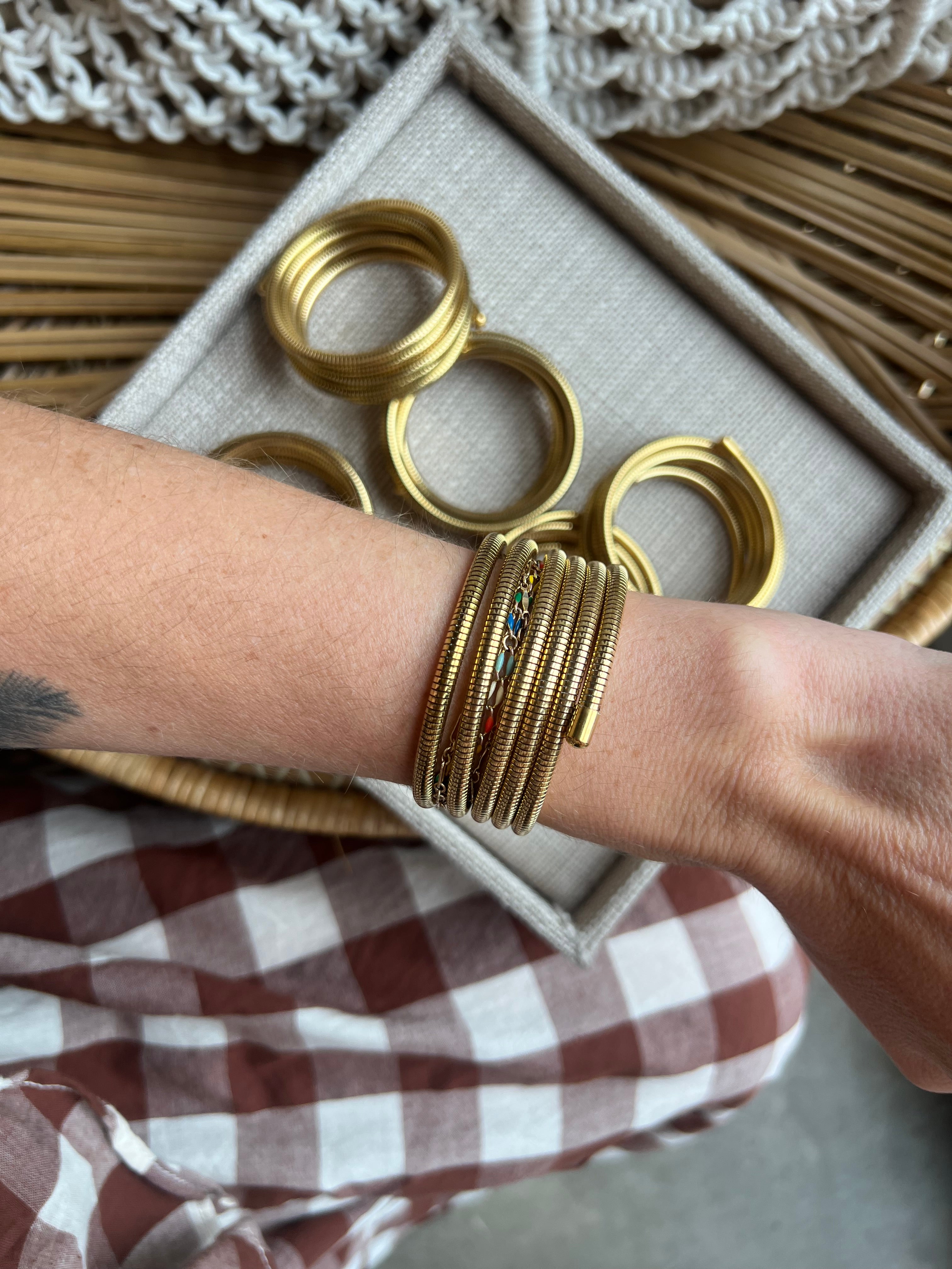 This water-resistant multi-strand wrap bracelet glitters in golden and shiny tones, creating a look of multiple thin bangles. Show off your elegance and confidence in style.