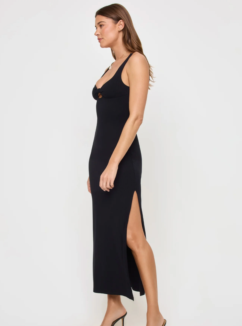 The Alexis Dress came to us in a dream. With an ankle-length silhouette, this fitted frock stands out from others with its dual cutout and twist detailing at the bust. Tank straps round out the look and a thoughtfully-placed slit adds some allure.
