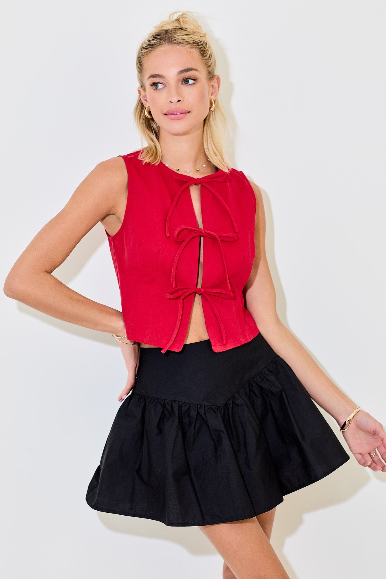 Denim Vest With Front Tie Detail (Red)