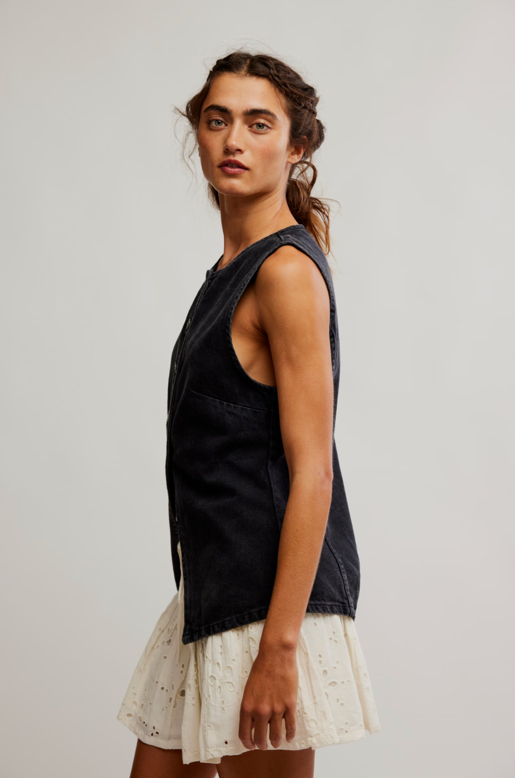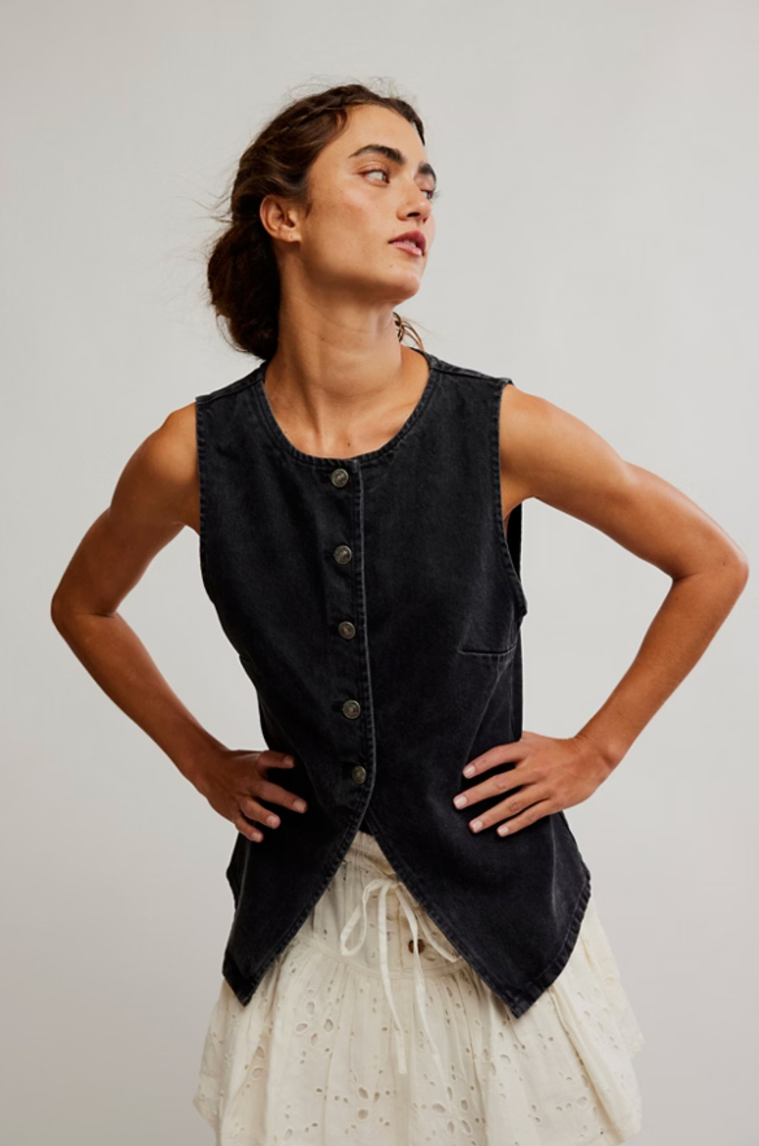 Silhouette is everything with this simple denim vest from We The Free, featured in a crew-neck style with intentional darting, buttons down the front, and a flared hem for an ultra-flattering fit.