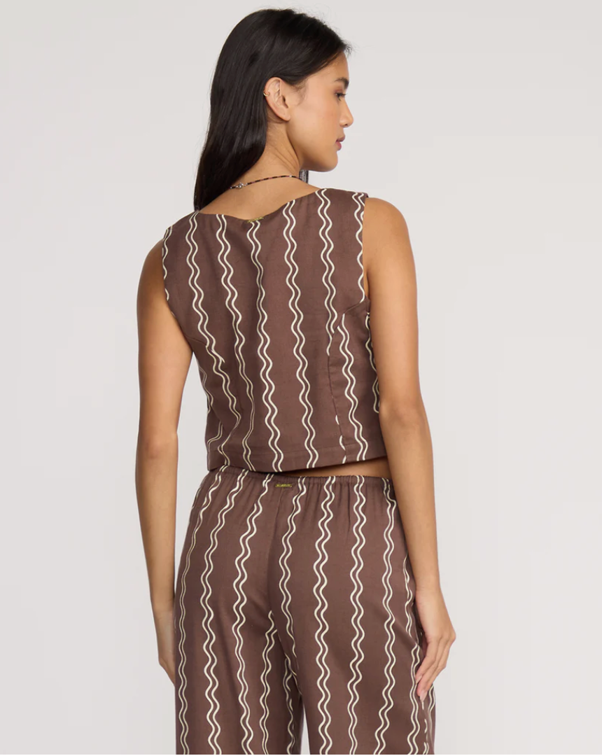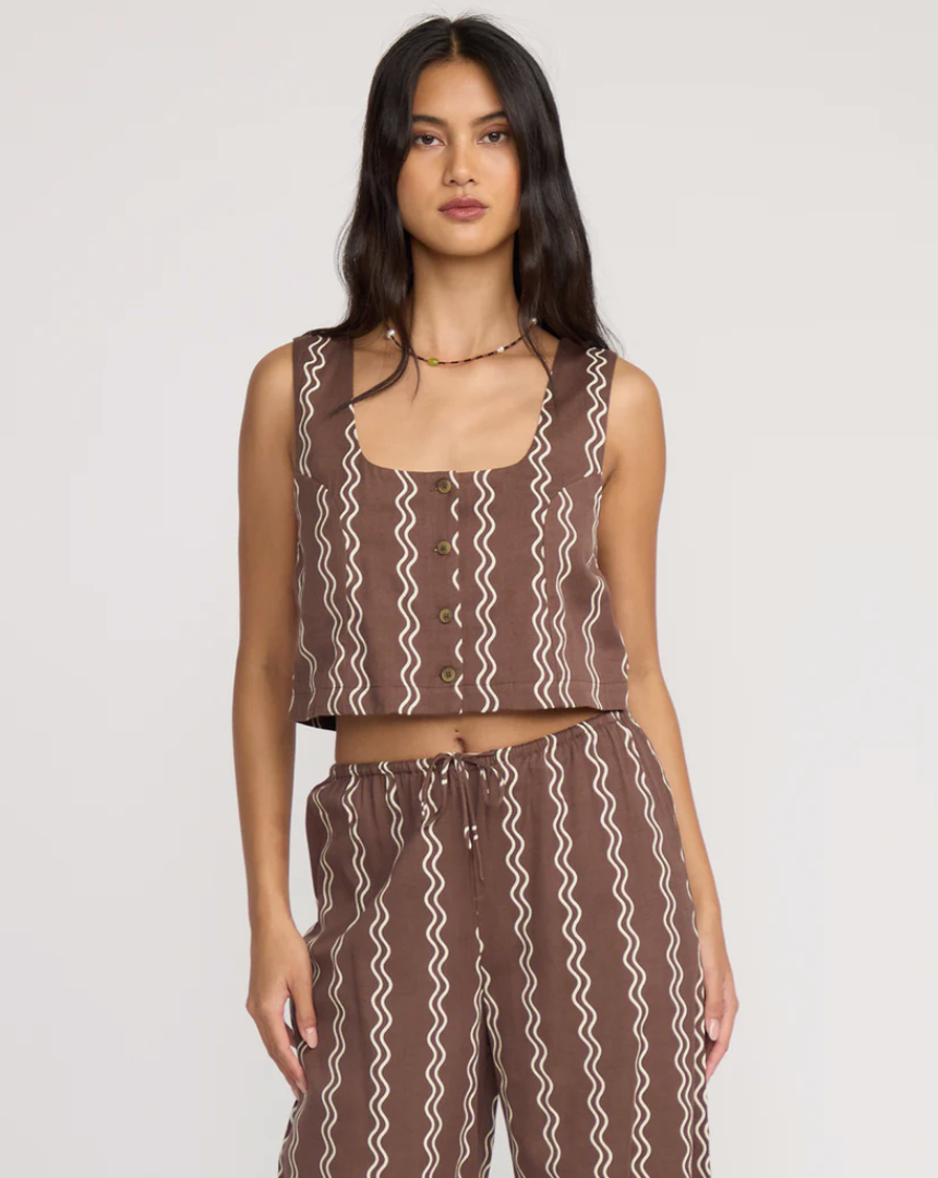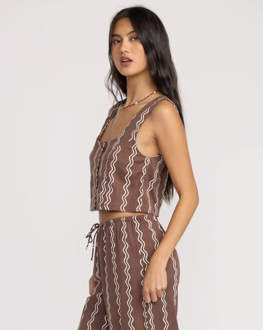 Our woven tank keeps things breezy with a relaxed fit and cotton-blend fabric. A button front and metal plate detail add a distinctive touch to this easygoing essential. Featured here in the Brown colorway.