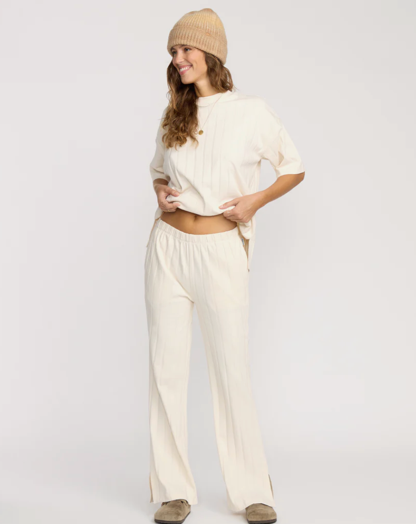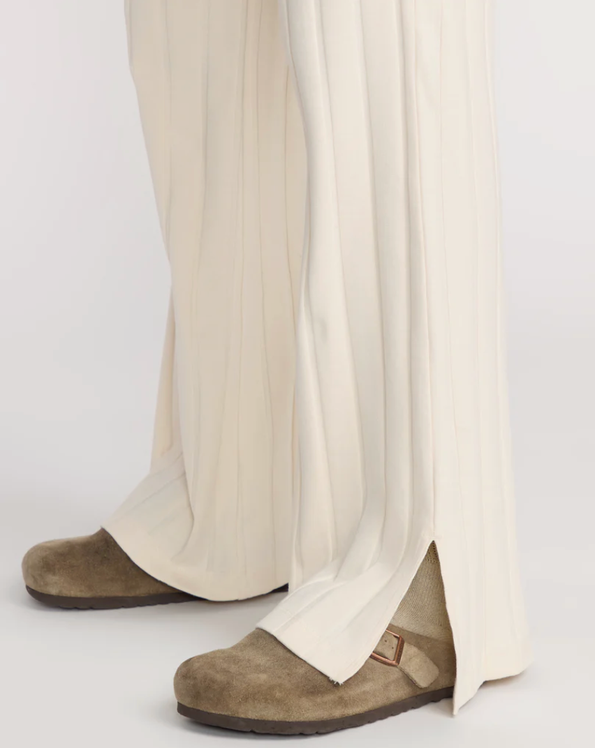 Sprint for the bus, pivot into a lounge chair; our Cass Knit Pants stretch with every move. The high waist stays put, split wide legs swish, pockets stash keys, and rib knit feels weekend-ready.