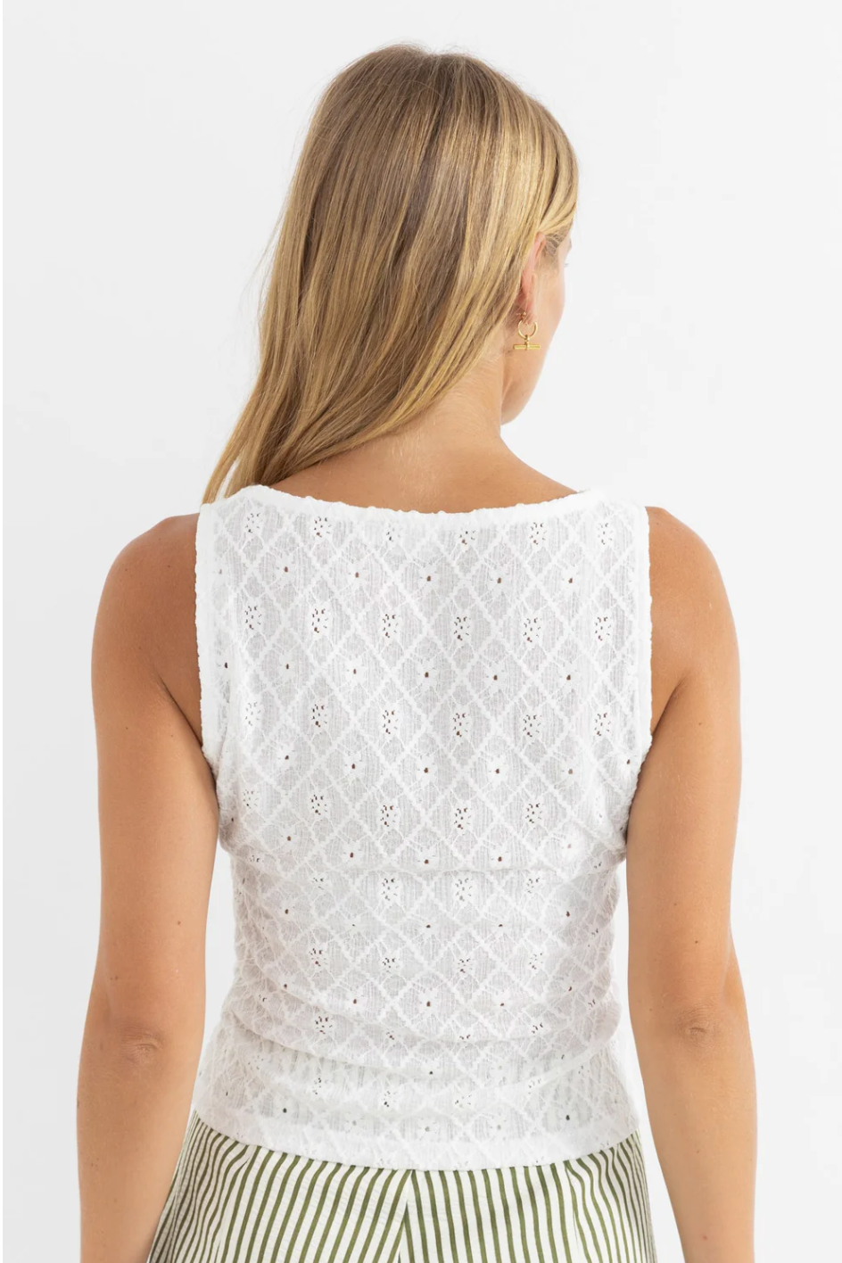 The Charm Tank in White features a high neckline crafted from semi-sheer lace fabric with decorative stitching. This elegant tank top effortlessly elevates any outfit, making it a must-have for your collection.