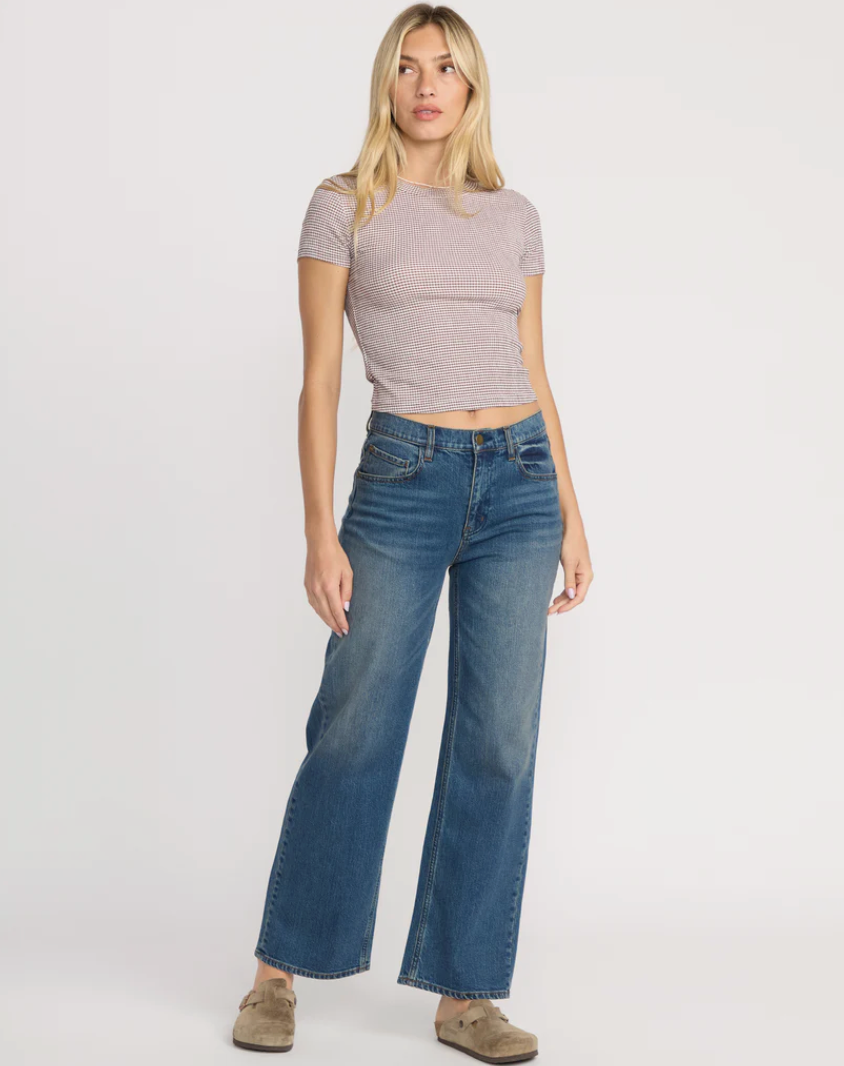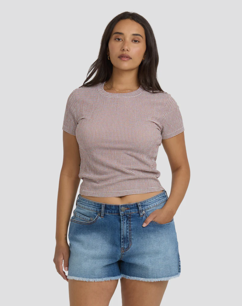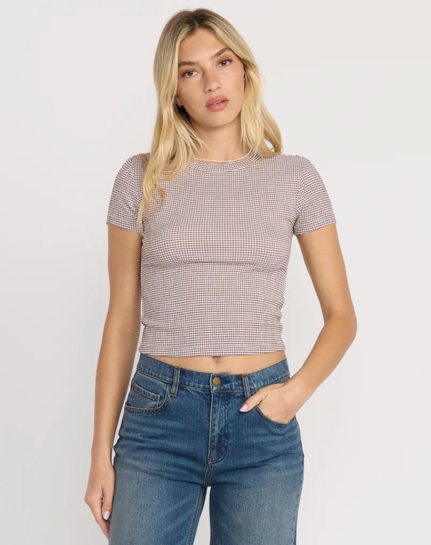 Soft, checkered knit hugs your skin as you slide into our Checked Out Knt T-Shirt. This fitted baby tee features a classic crew neck and a subtle metal plate accent, stretching comfortably for effortless layering. Featured here in the Espresso colorway.