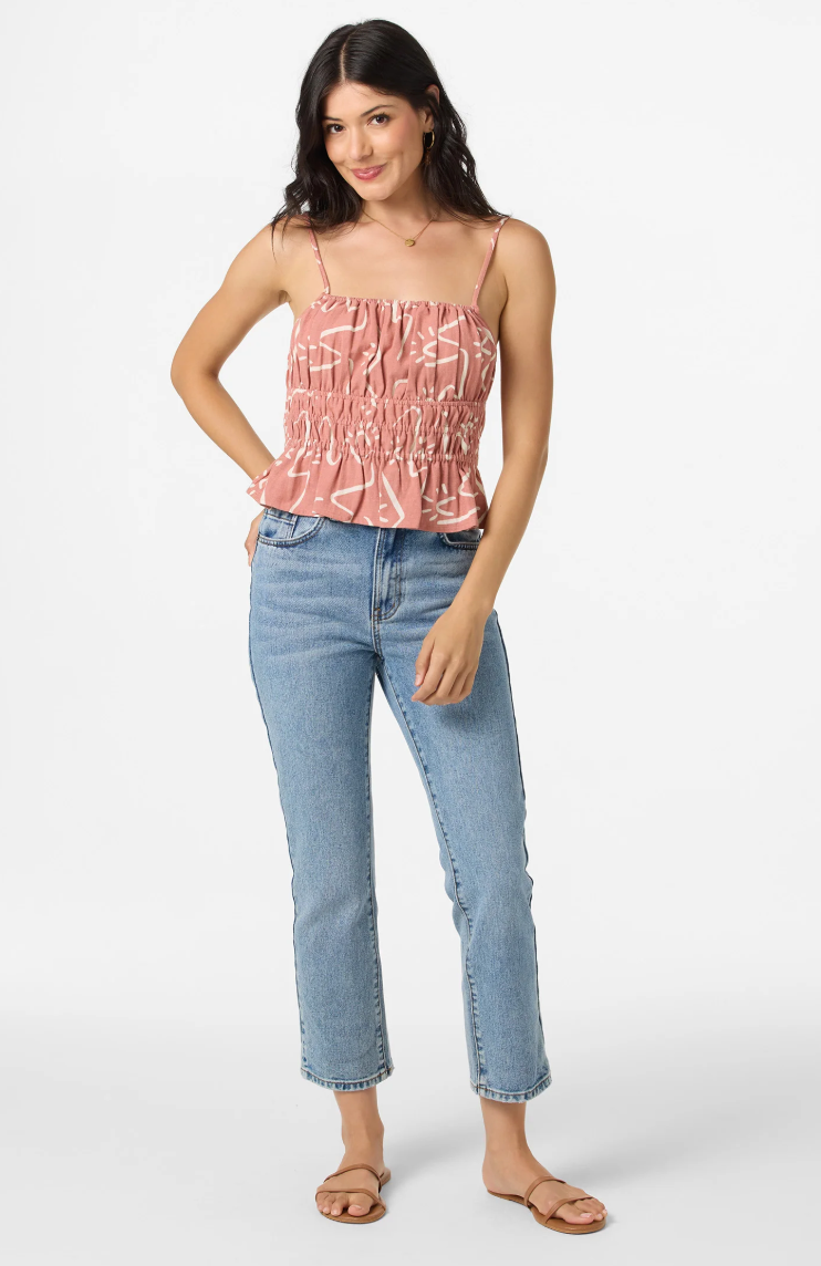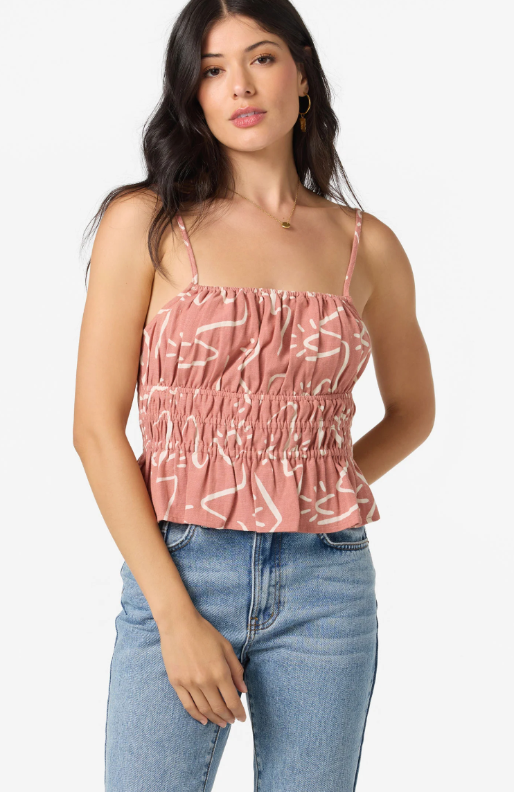 Light, breezy, and oh so sweet, this woven tank features delicate elastic details and an easy fit, made for sunlit days and salty air.