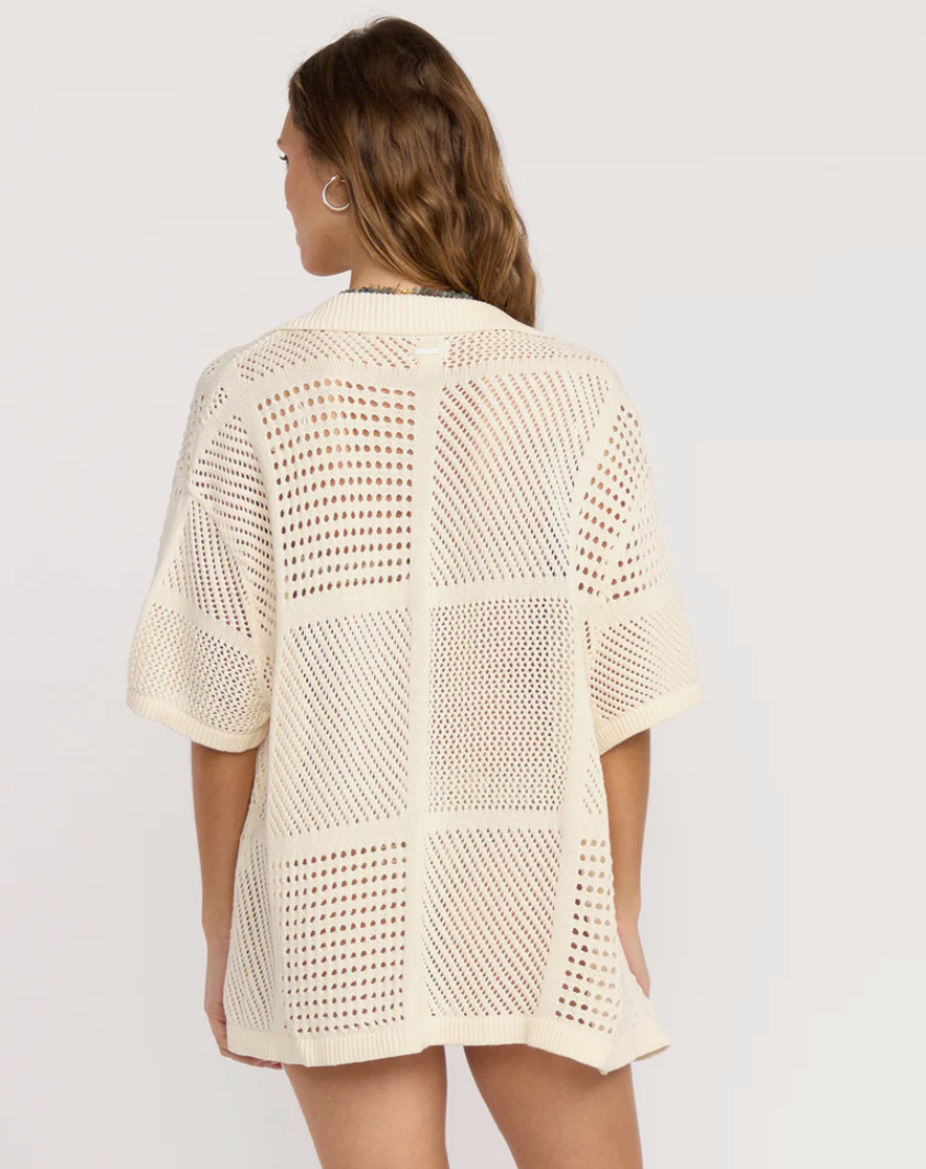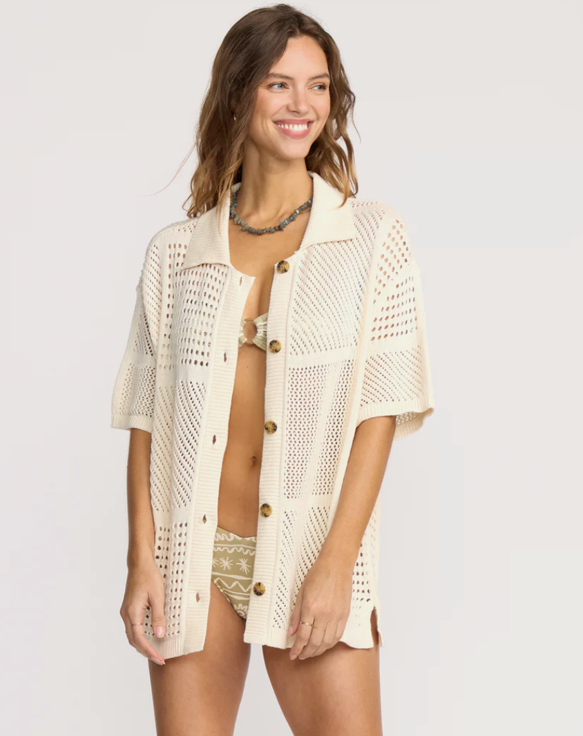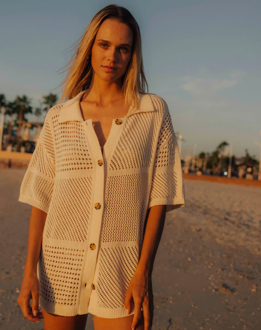 Sun dipped, breeze picked up; we reached for our Cool Down Short Sleeve Sweater. It drapes oversized in airy cotton open-stitch, buttons up quick, and flaunts a subtle metal plate for effortless polish. Featured here in the Whitecap colorway.
