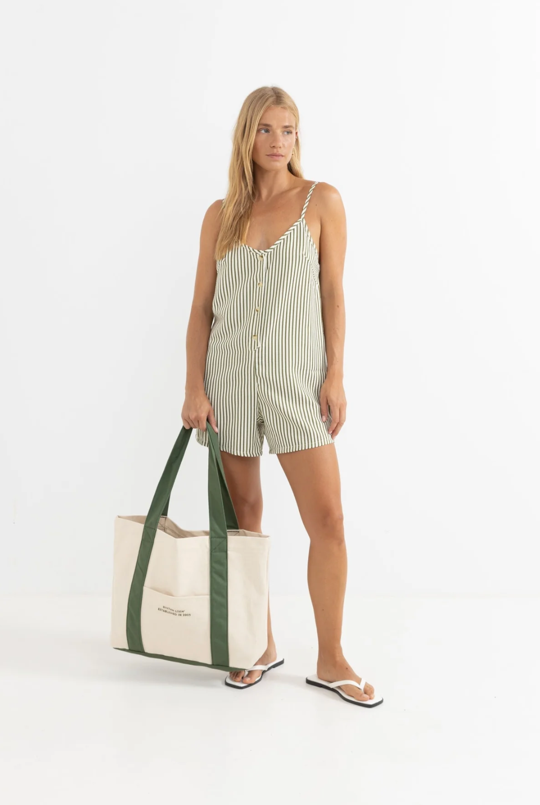 The Cove stripe adjustable romper in aloe offers a relaxed fit with a V-neck button front opening. Adjustable straps provide a customizable fit, making it a versatile choice for warm days.