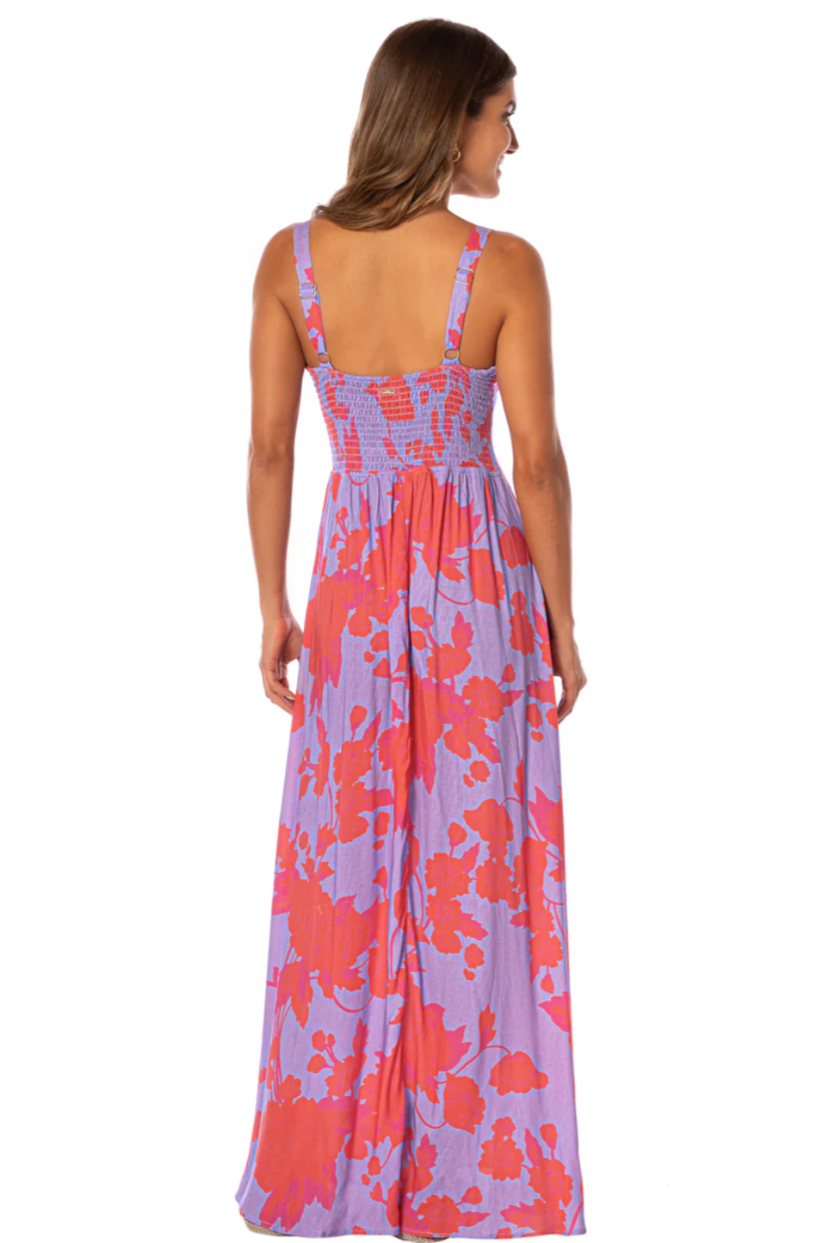 Like a mirage in the desert, the Oasis is the perfect respite from a hot summer's day. With a flattering V neckline and buttons going down the front to its unique slit opening, the Oasis dress in Candy Flowery statement print is a refreshing choice!