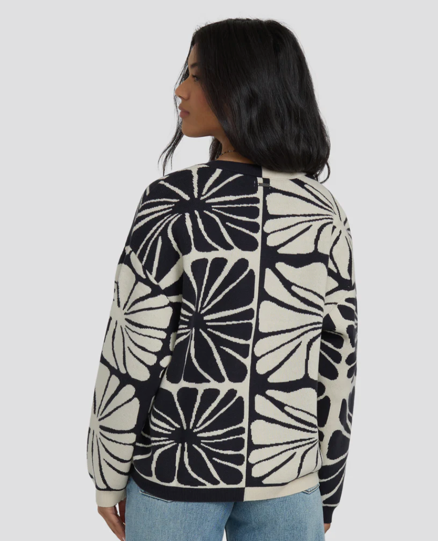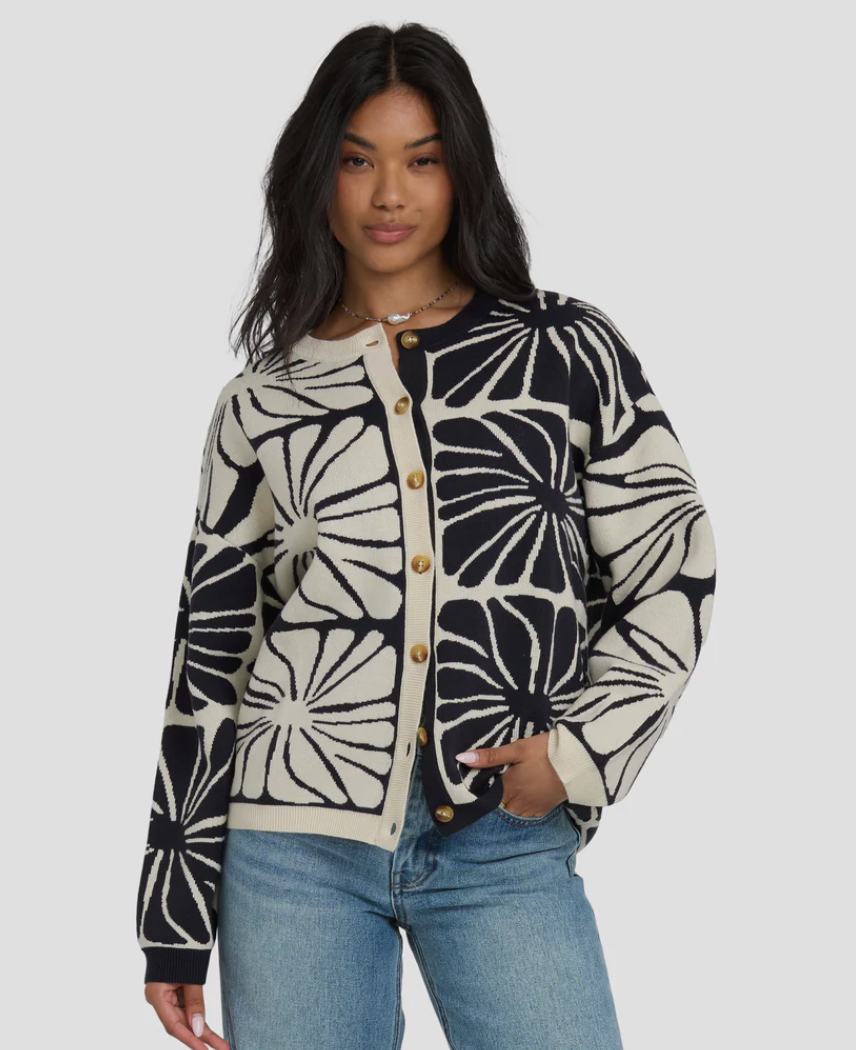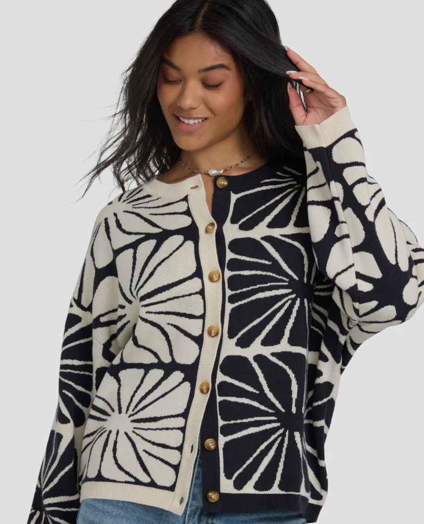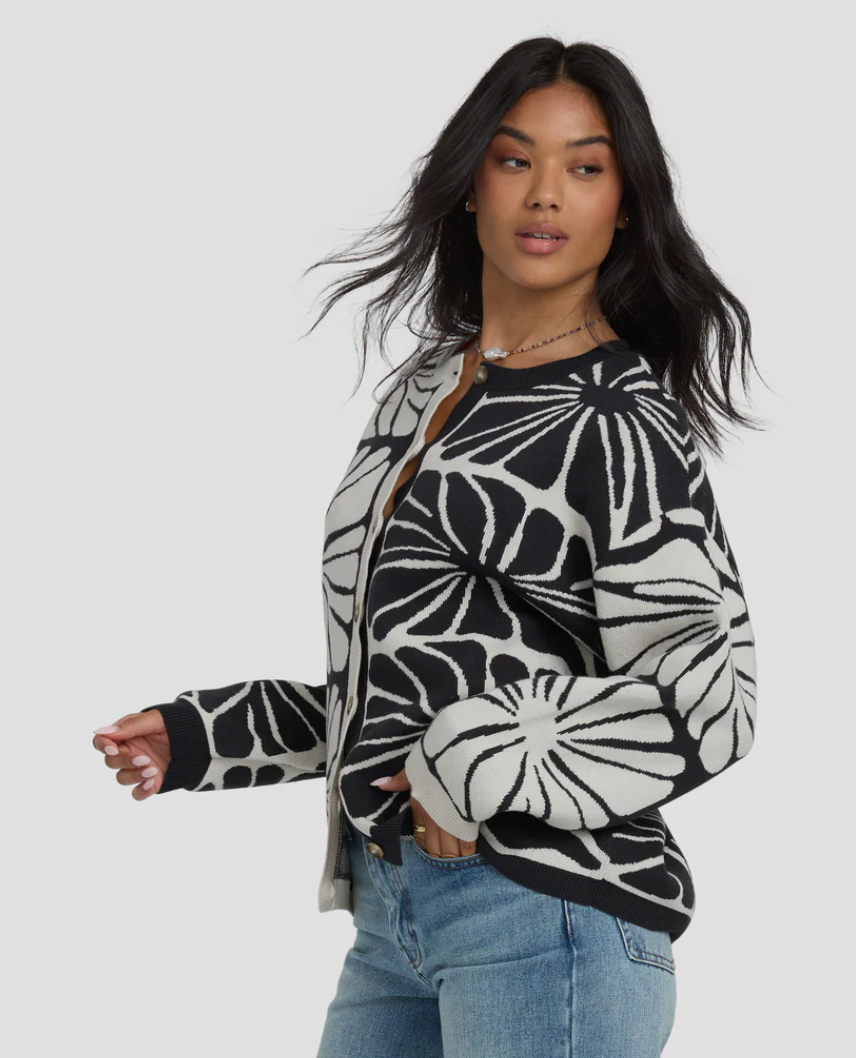 Cozy up in our relaxed-fit cardigan, crafted from soft jacquard fabric. The classic crew neckline and front button placket create a timeless look, while a sleek metal plate adds modern edge. Featured here in the Black colorway.