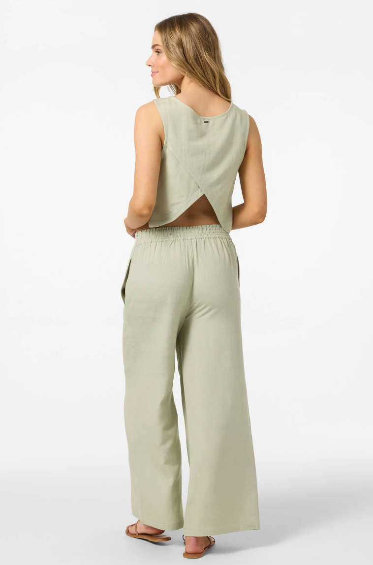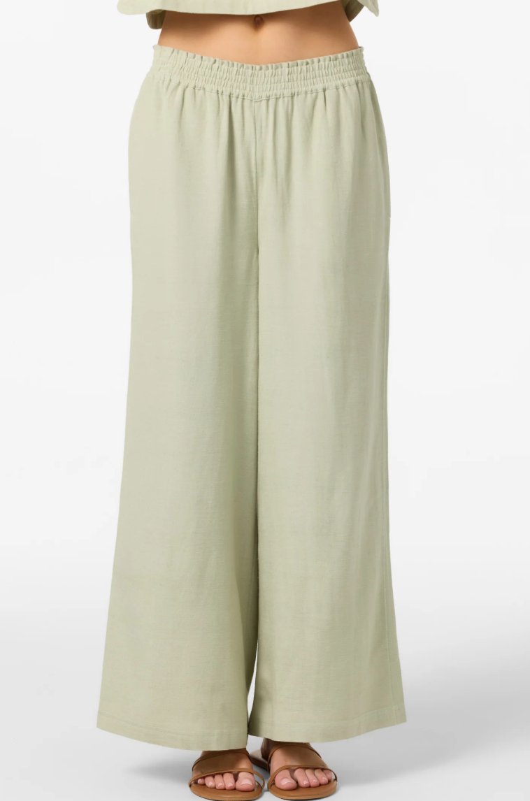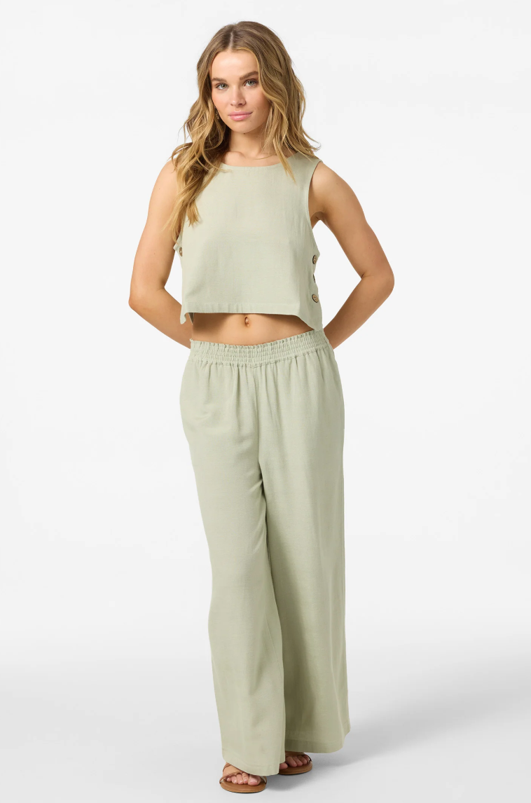 Essential woven pant that has a relaxed, flowy leg fit, solid color wash and flood length fit.