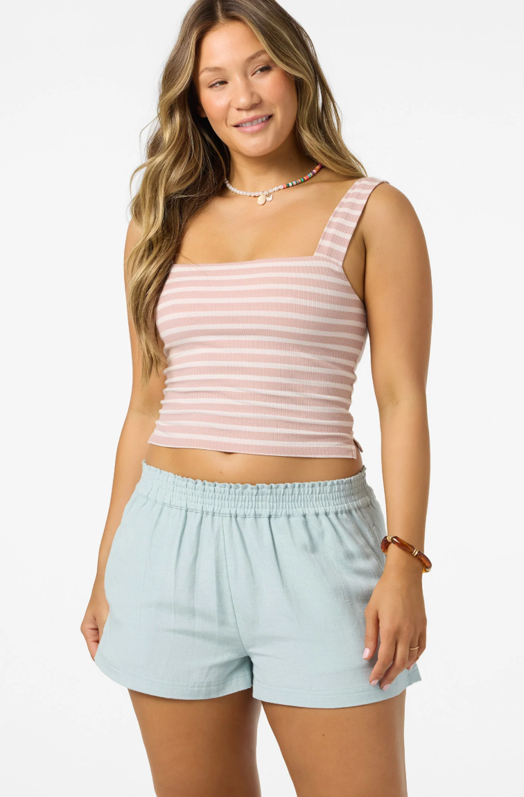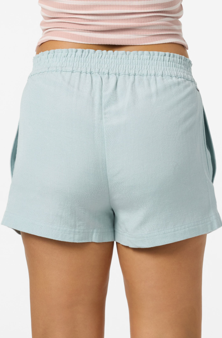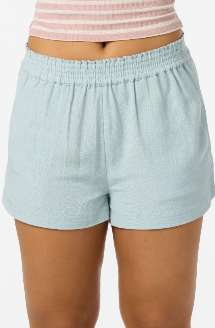 Essential woven short that has a relaxed flowy fit and ruffled, smocked waistband.