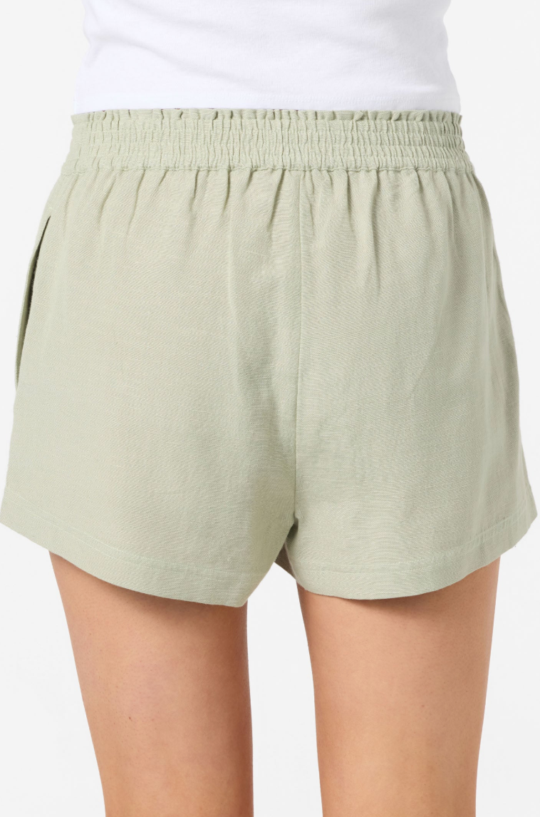 Essential woven short that has a relaxed flowy fit and ruffled, smocked waistband.