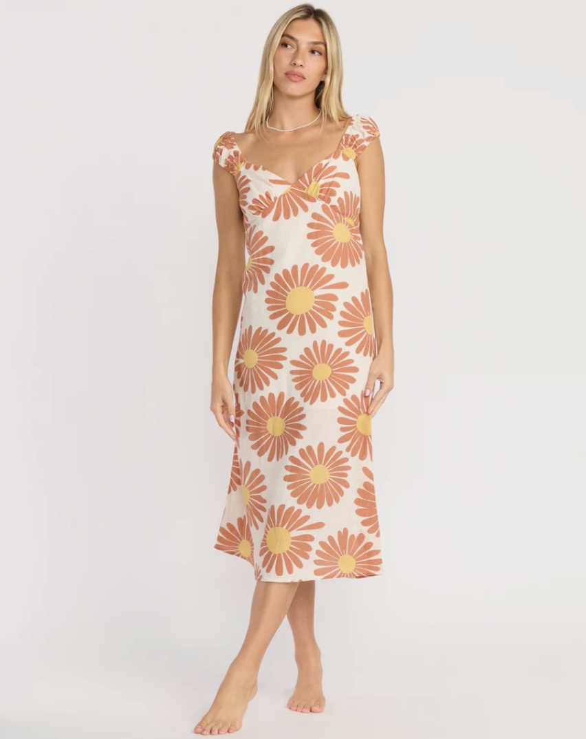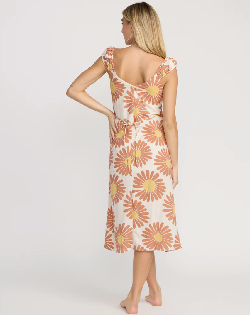 Sunlit brunch calls; you float in, sash-tie fluttering. Soft puff sleeves skim your shoulders. Our midi dress blends airy cotton-linen, a 48-inch V-neck silhouette with adjustable back ties and a subtle metal plate finish. Featured here in the Whitecap colorway.