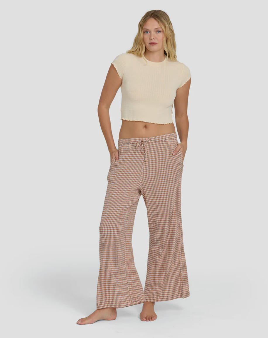 Soft checks, easy days. The Wanderer Bitty Check Pants bring a laid-back polish to your beach-to-brunch routine, done in a sugar almond hue that feels like late-afternoon light. The woven cotton-viscose blend drapes with a relaxed, airy feel, while the elastic waist keeps things cruisy and comfortable as you move. Wear them over your bikini, pair with a tiny tee, or half-tuck a shirt and call it your new uniform. Loose, lightweight, and made for going wherever the day decides. Featured here in the Sugar Almond colorway.