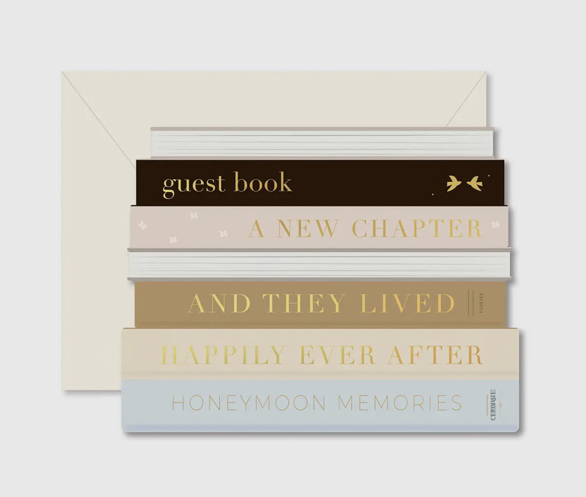 A cute and relatable stack of wedding books for the couple! Creative die-cut with gold foil accents 4.25 × 5.5 folded card, blank interior